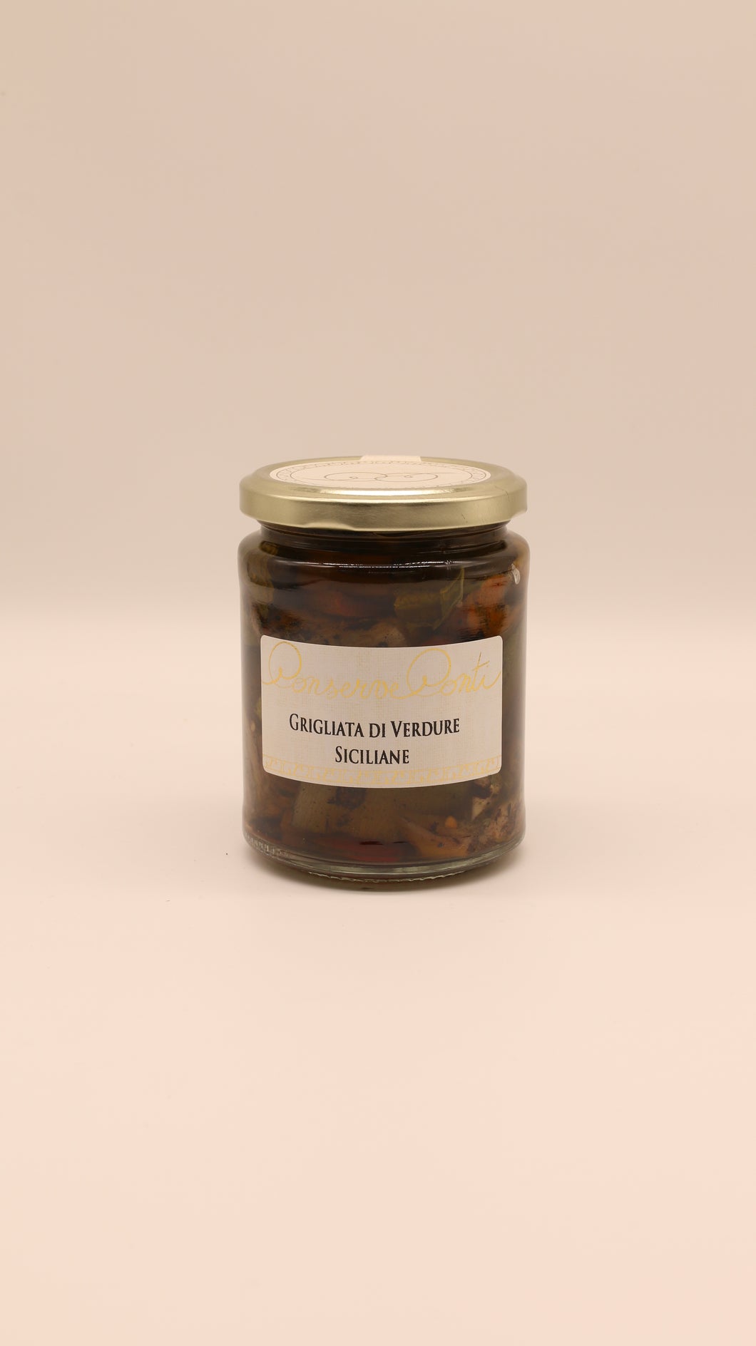 Eine liebevoll zubereitete Gemüsekomposition aus Auberginen, Paprika und Zucchini, handverlesen, gegrillt und verfeinert mit aromatischem sizilianischem Oregano, frischer Minze, Chili und Knoblauch. Diese Spezialität verkörpert das Beste der sizilianischen Handwerkskunst und bringt mediterranes Aroma direkt auf den Teller.