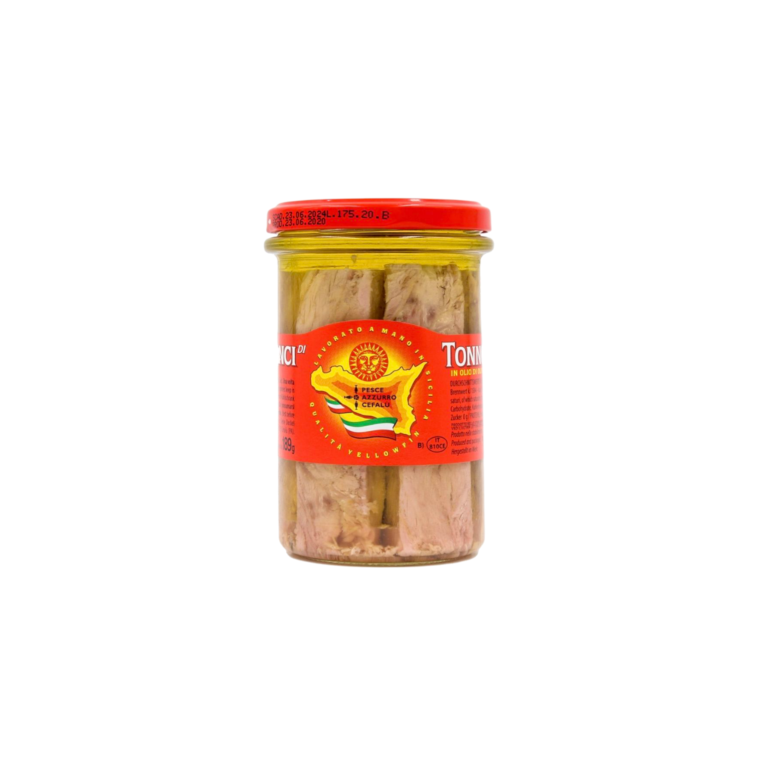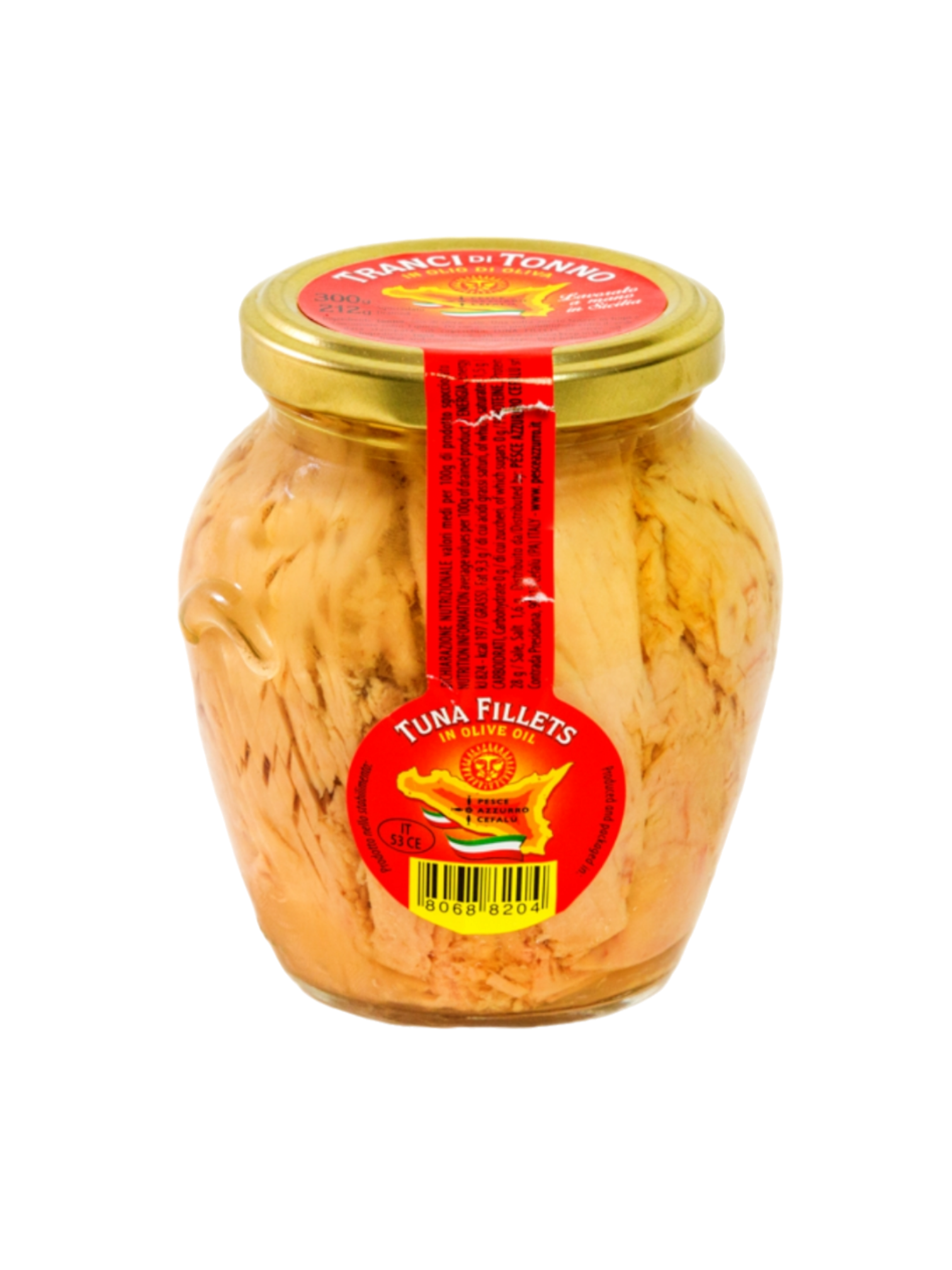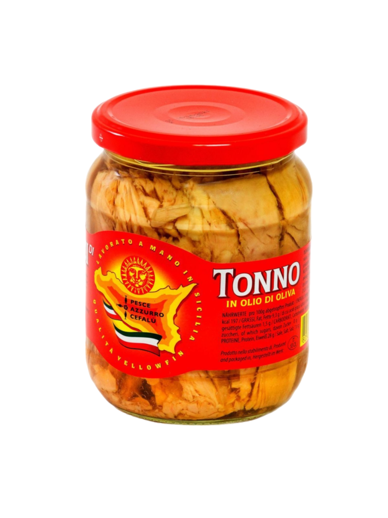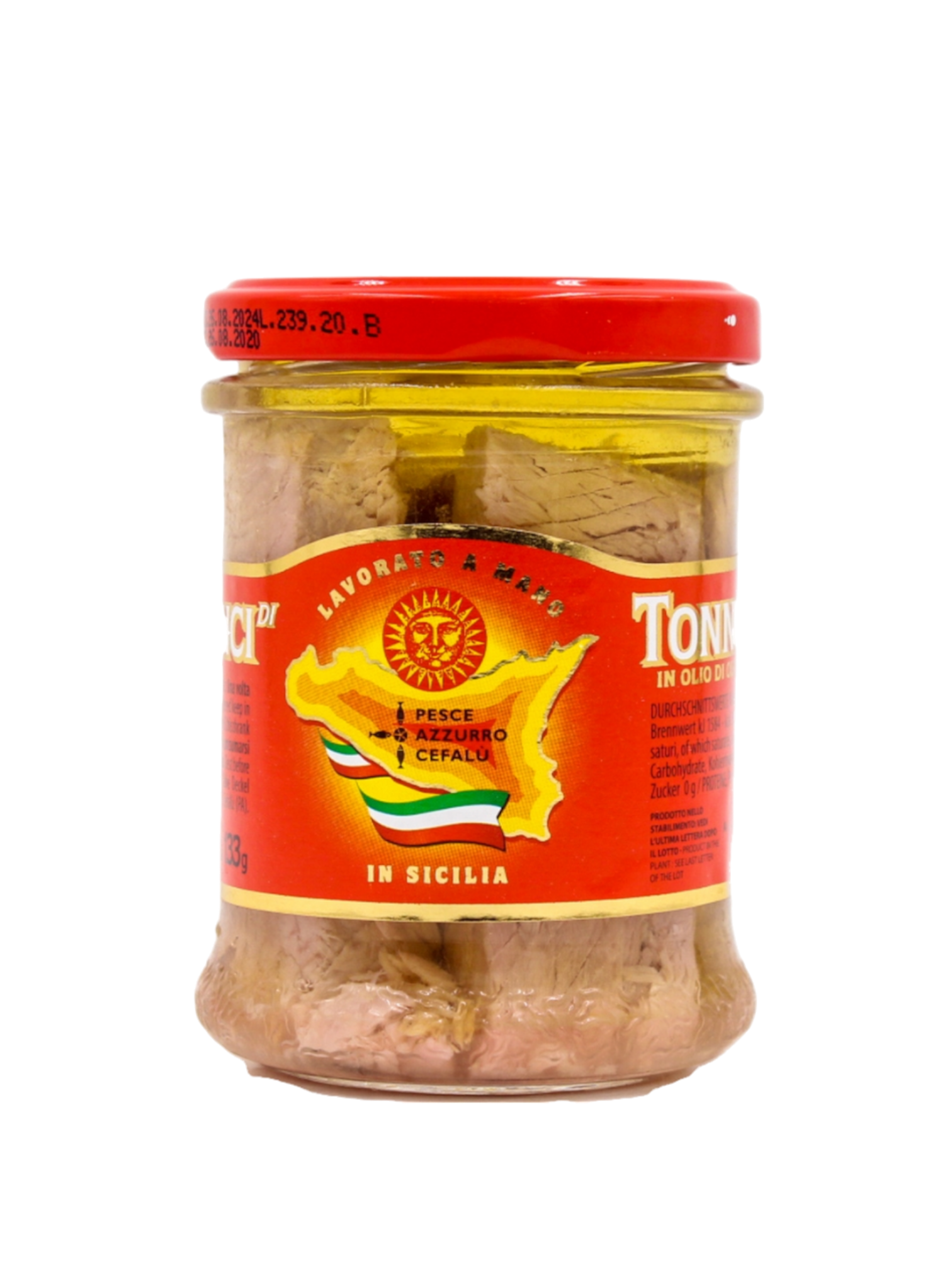 Thunfischfilets in Olivenöl, sorgfältig ausgewählt im Glas.Handarbeit in Sizilien nach alter Tradition.