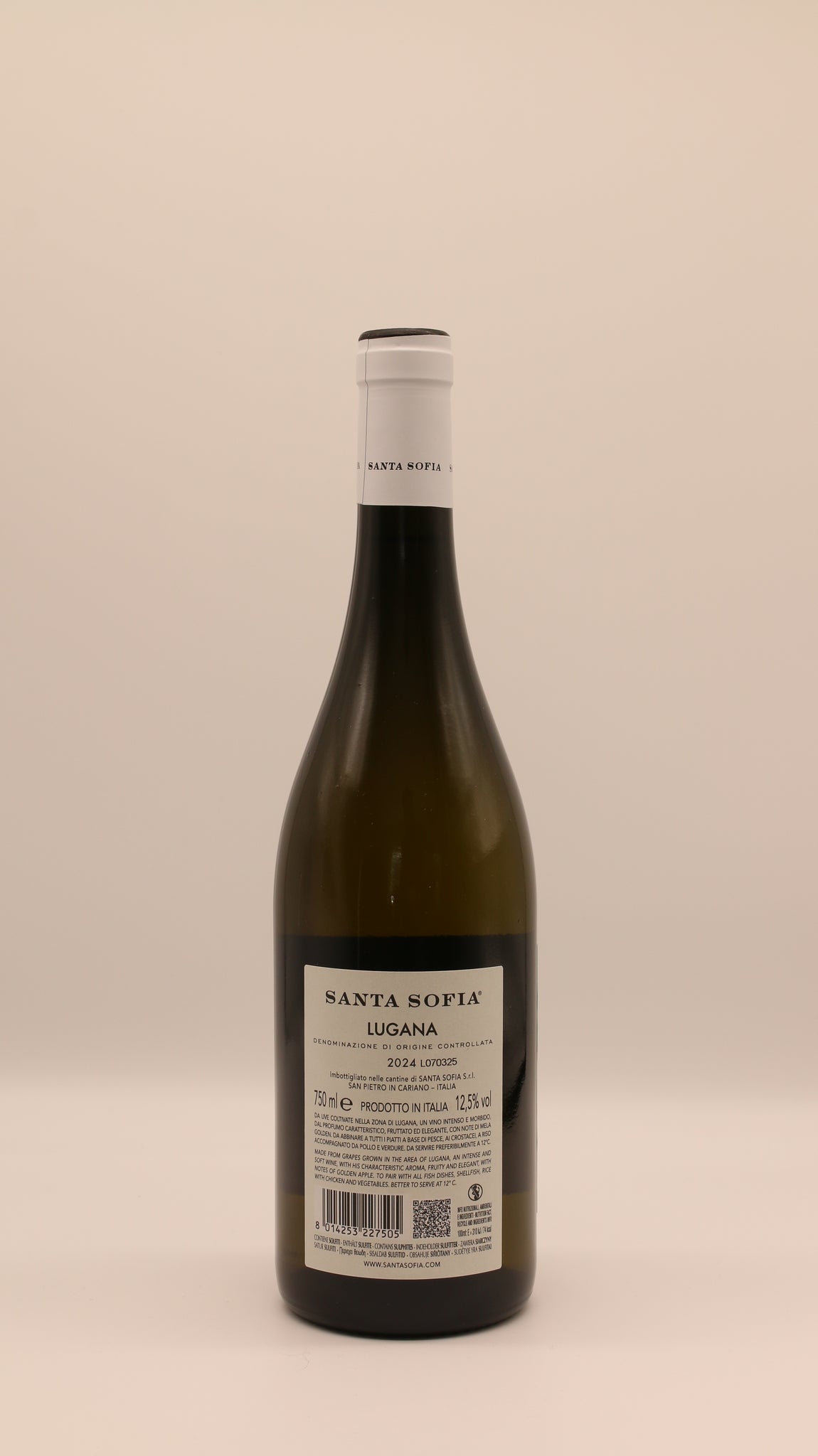 Flasche Lugana 2024 von Santa Sofia – eleganter Weißwein vom Gardasee mit frischem Charakter und klassischem Etikett im Santa-Sofia-Stil.